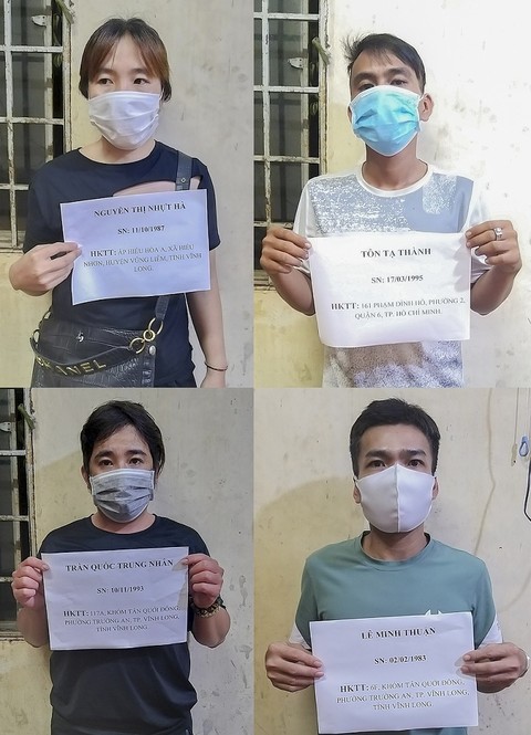 Tiến hành xét nghiệm nhanh, 4 đối tượng gồm: Nguyễn Thị Nhựt Hà (SN 1987, ngụ huyện Vũng Liêm), Tôn Tạ Thành (SN 1995, ngụ TPHCM), Trần Quốc Trung Nhân (SN 1993) và Lê Minh Thuận (SN 1983, cùng ngụ phường Trường An) đều dương tính với chất ma túy đá.
