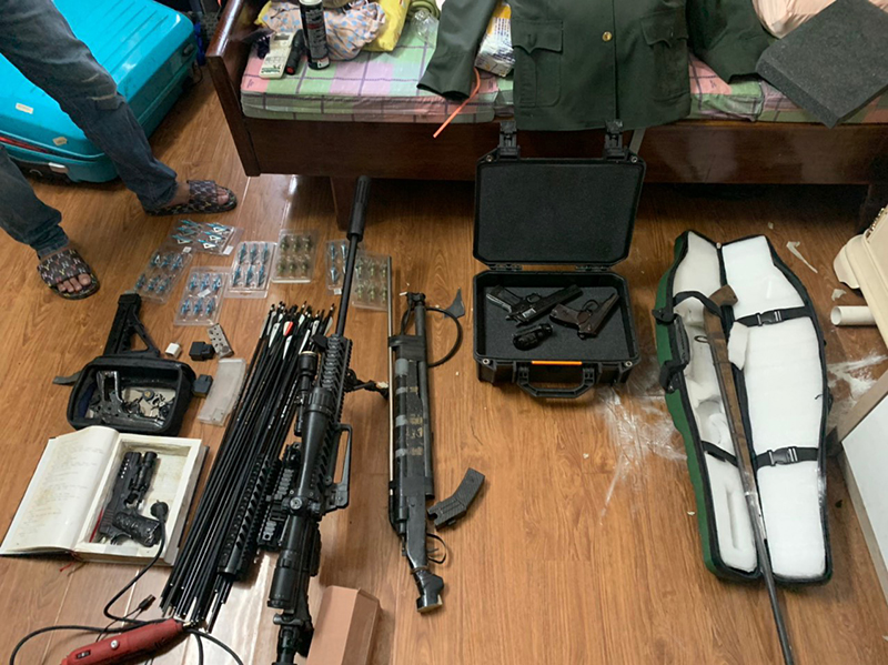 Căn cứ tài liệu thu thập, CQĐT đã tiến hành khám xét nơi ở của Nguyễn Tiến Dũng thu giữ 7 khẩu súng quân dụng, 1 khẩu súng kíp, 1 khẩu súng hơi, 1 cây cung, 6 mũi tên; 65 viên đạn và 1 mô hình quả lựu đạn. Tại nhà của Ly, Công an quận Đống Đa cũng thu giữ nhiều loại ma túy tổng hợp loại Ketamin và Methaphetamine.