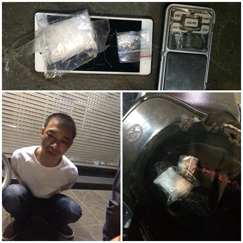 Tại thời điểm kiểm tra, tổ công tác phát hiện trong cốp xe của đối tượng Nguyễn Hoàng Dương có một cân tiểu ly cùng những biểu hiện đáng ngờ của đối tượng. Sau một hồi kiểm tra, tổ công tác phát hiện trong lớp lót của mũ bảo hiểm đối tượng đội có một gói nilon to chứa tinh bột màu trắng nghi là ma túy đá.
