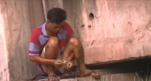 Một con nghiện đang phê thuốc dưới chân cầu bộ hành số 7 đại lộ Võ Văn Kiệt (ảnh chụp ngày 14/6)