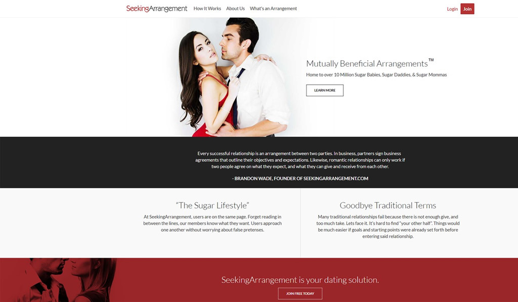 | Trang web SeekingArrangement với khẩu hiệu “Mối quan hệ dựa trên điều khoản của riêng bạn”. |
