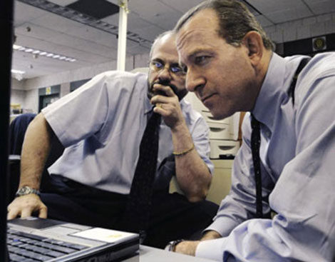| Alan Sandomir (trái) và Steven Lane, hai thám tử hàng đầu của MSVS đang điều tra bằng chứng video trong một vụ án. |