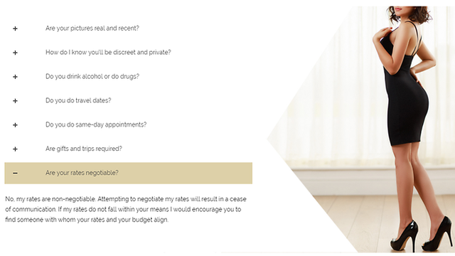 Mục câu hỏi thường gặp cho thấy Dalia tự gọi mình là một “trải nghiệm bạn gái”. Tại phần thông tin chung, cô cho biết có thể tiếp nhận khách, hoặc có thể đến chỗ của khách và phục vụ cho cả khách hàng nam, nữ và các cặp đôi.
