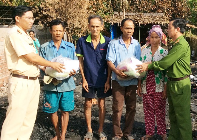 | Ông Năm Liệt (phải) trao quà hỗ trợ gia đình có nhà bị cháy ở Mỹ Tú. Ảnh: Nhật Tân/Zing.vn |