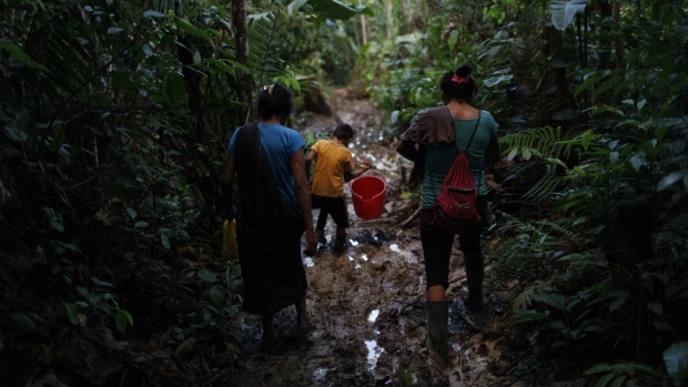 | Edma Duran, 40 tuổi, đi qua con đường bùn lầy với 2 người con sau khi lượm những lá coca hư hỏng trên trang trại của họ đã bị ảnh hưởng bởi chương trình xoá bỏ cây coca của chính phủ ở Nuevo Canaveral, Peru |