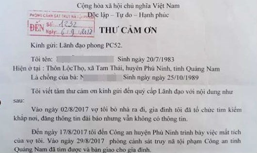Trong lá thư gửi Giám đốc Công an tỉnh Quảng Nam, ông D đã viết: “Những ngày tháng qua, vợ chồng tôi đã mất ăn mất ngủ vì không biết con gái chúng tôi ở phương trời nào. Nếu không có các anh công an, có thể con gái tôi sẽ rơi vào những cám dỗ, cạm bẫy và không biết sẽ ra sao. Tôi chân thành cám ơn các anh đưa con gái tôi về với gia đình...”.