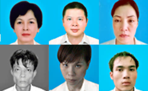 | Các đối tượng liên quan bị bắt giữ (từ trái qua phải, trên xuống dưới) Nguyễn Thị Hạnh, Lương Minh Tuấn, Nguyễn Thị Huệ, Nguyễn Văn Anh, Đào Thị Loan, Bùi Đăng Đức |