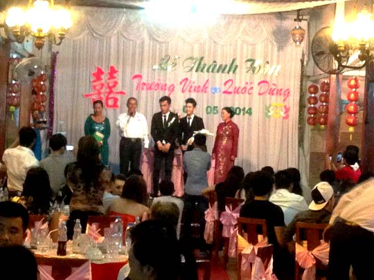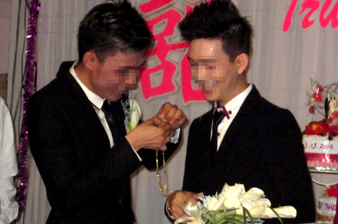 Đám cưới có mặt một số người thân của “hai họ” và hơn 200 thực khách là bạn bè của chú rể và “cô dâu”. Những thực khách đến dự đám cưới đa số là người đồng tính. Trước sảnh lớn đãi tiệc có một tấm ảnh được dựng lên rất to chụp ảnh “cô dâu, chú rể” của hai chàng trai.